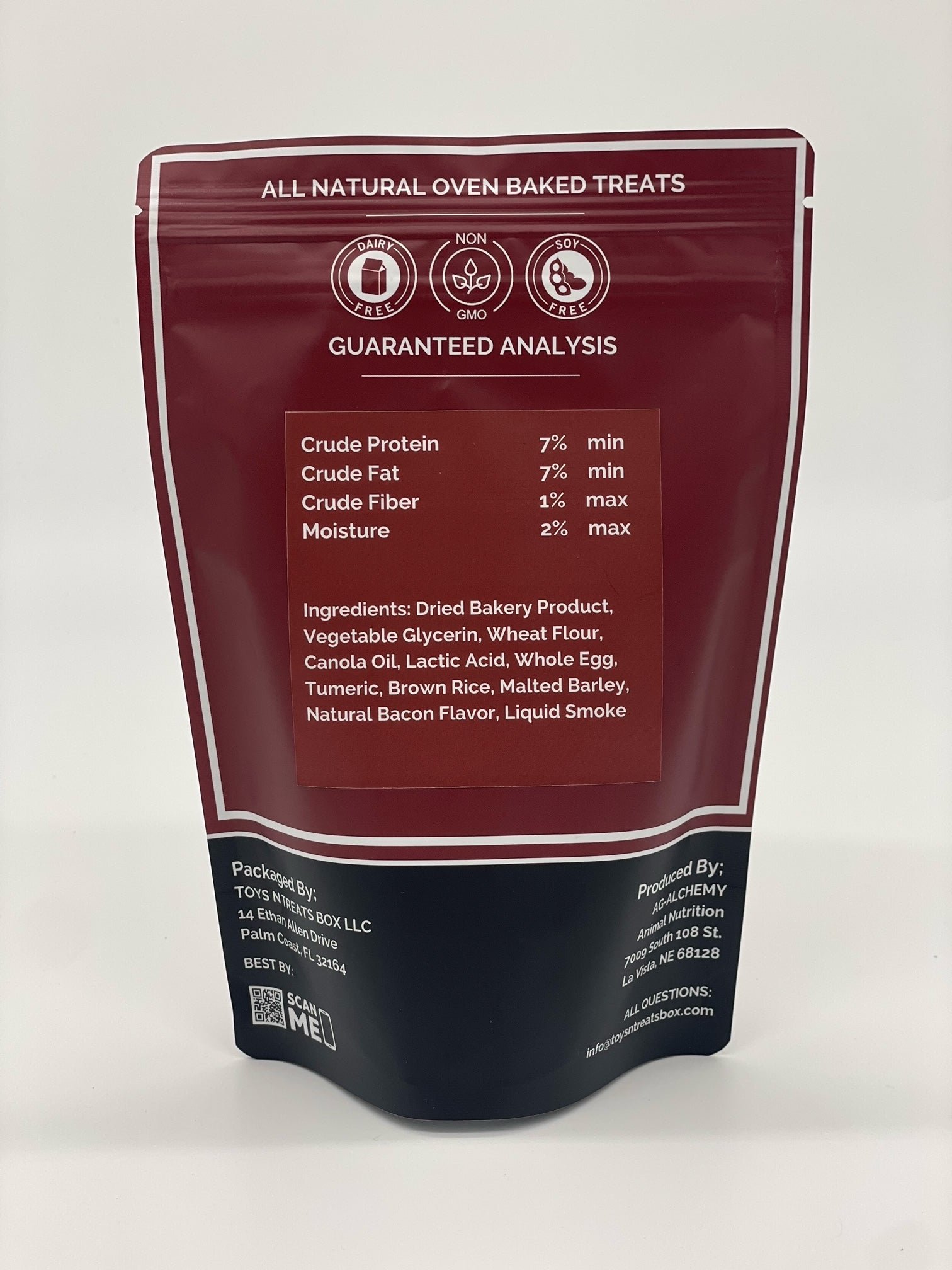 Ingredients: Dried Bakery Product, Vegetable glycerin, Wheat Flour, Canola Oil, Lactic Acid, Whole Egg, Turmeric, Brown Rice, Malted Barley, Natural Bacon Flavor, Liquid Smoke, Mixed Tocopherols, Rosemary Extract.