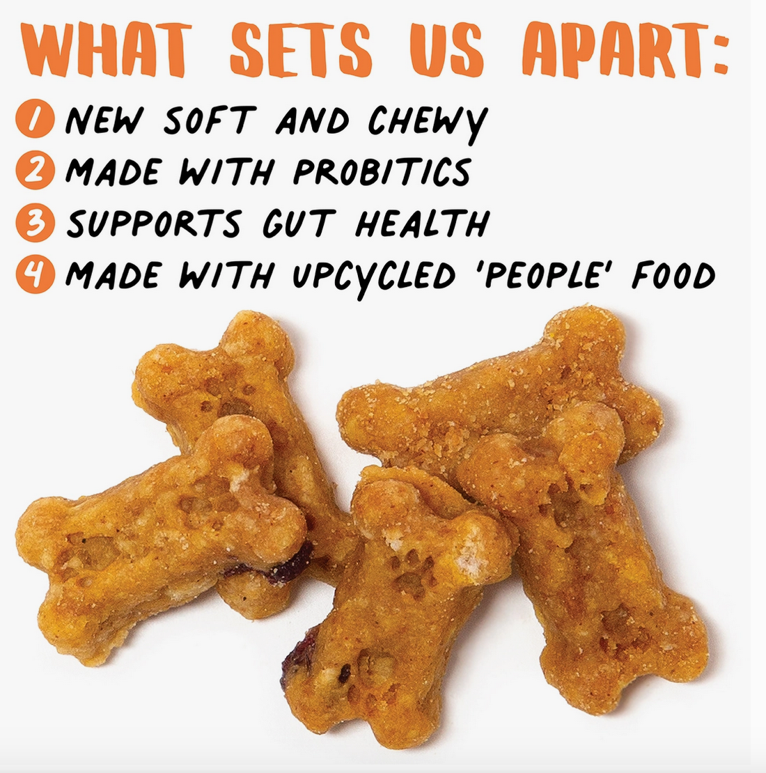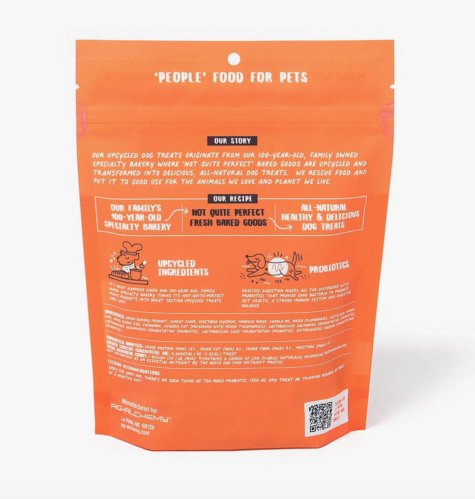 Ingredients: Dried Bakery Product, Wheat Flour, Vegetable Glycerin, Pumpkin Puree, Canola Oil, Cranberries, Lactic Acid, Brown Rice, Whole Egg, Cinnamon, Natural Cranberry Flavor, Mixed Tocopherols, Rosemary Extract, Chicken Fat (Preserved with Mixed Tocopherols), Lactobacillus salvarius Fermentation, Lactobacillus acidophilus Fermentation, Lactobacillus casei Fermentation, Enterococcus faecium Fermentation.